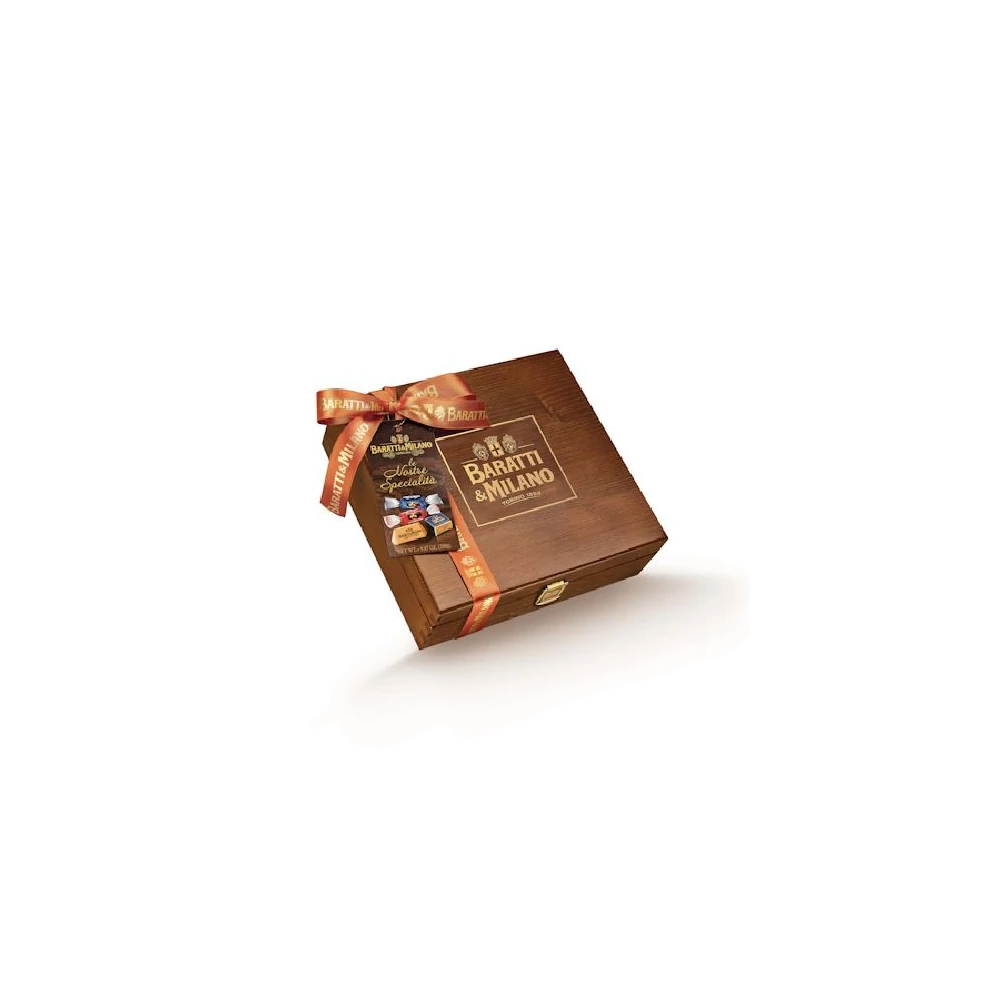 Ez az elegáns, domborműves logóval ellátott fadoboz válogatott csokoládékat tartalmaz: tejcsokoládé, étcsokoládé egész mogyoróval, cremini és gianduiotti.