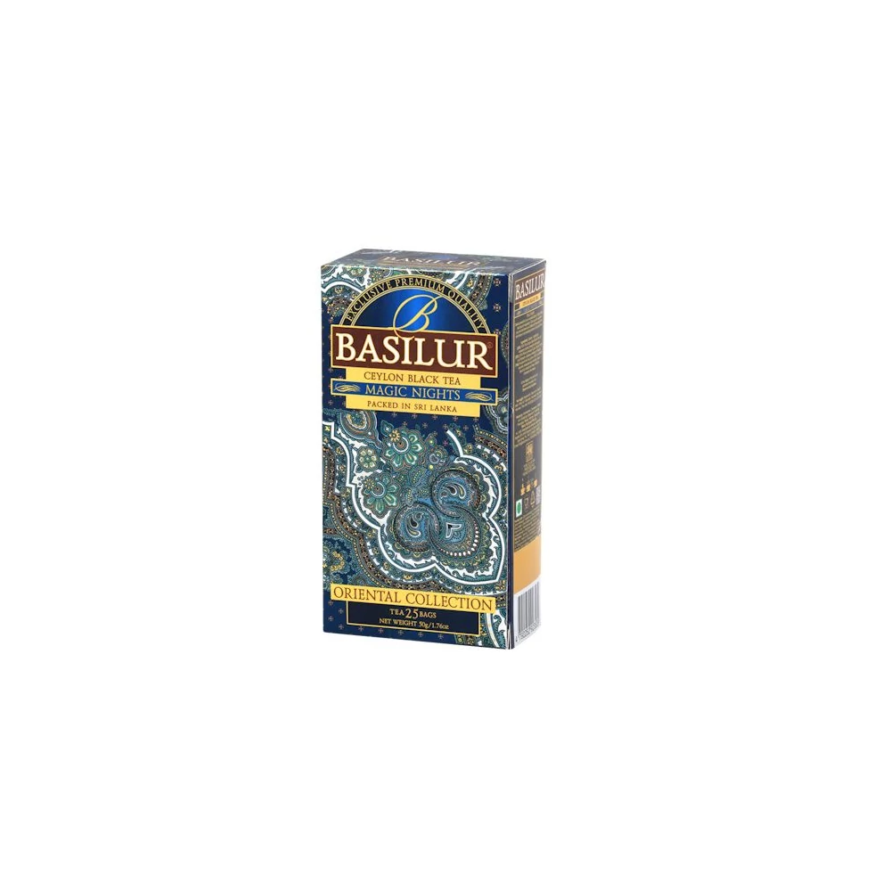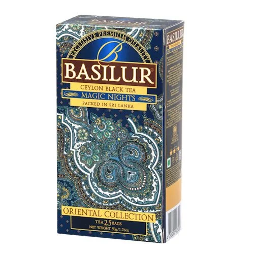 Kiváló minőségű Sri Lankai Magic Nights Fekete tea 25x2g filter elegáns absztrakt mintás kék színű dobozban. Összetevők: ceyloni fekete tea, természetes eper, sárgabarack, ananász és papaya.