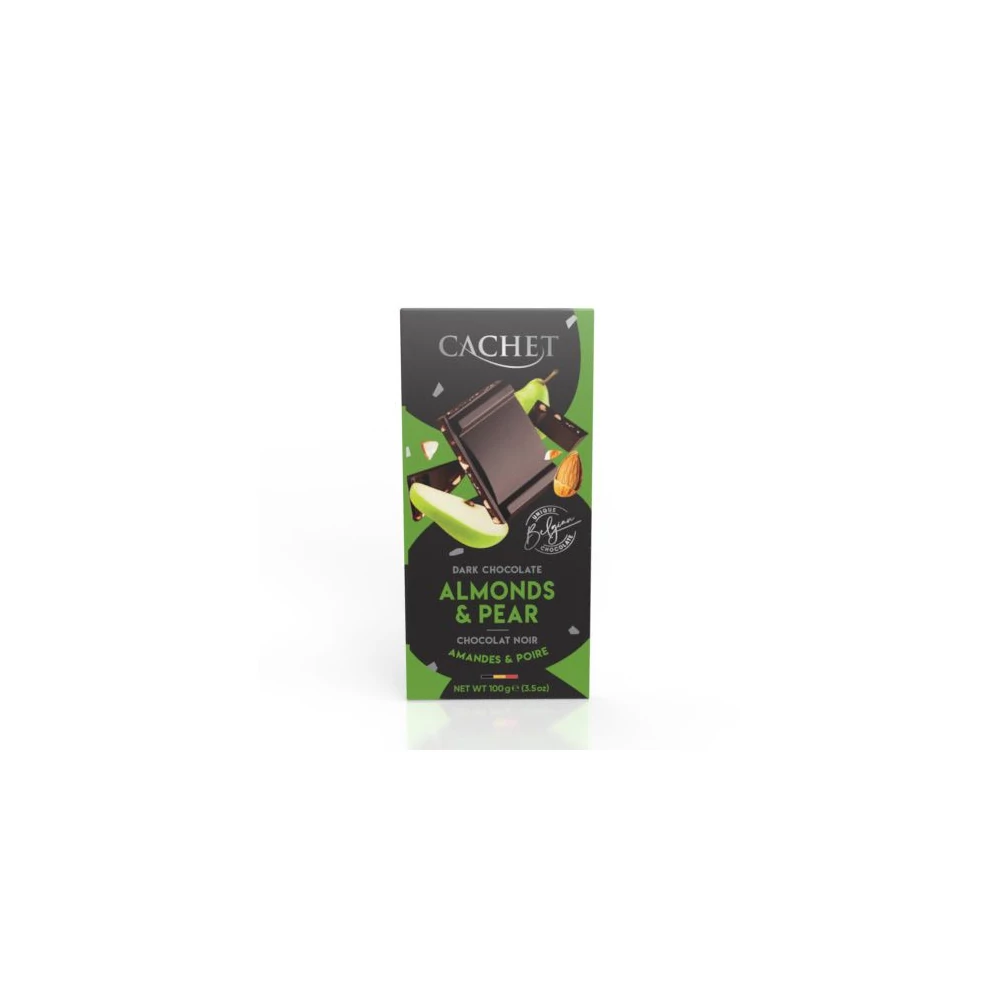 Minőségi belga táblás csokoládé ét 57% körte-mandula ízesítéssel, papírba csomagolva.