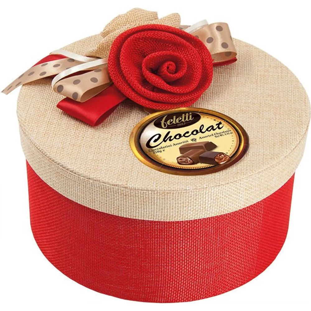 Olasz prémium tej és étcsokoládé válogatás, mogyoró-, naracs, és marettós ízesítéssel, kalapdobozt formázó prémium karton csomagolásban, szürke és piros színben.