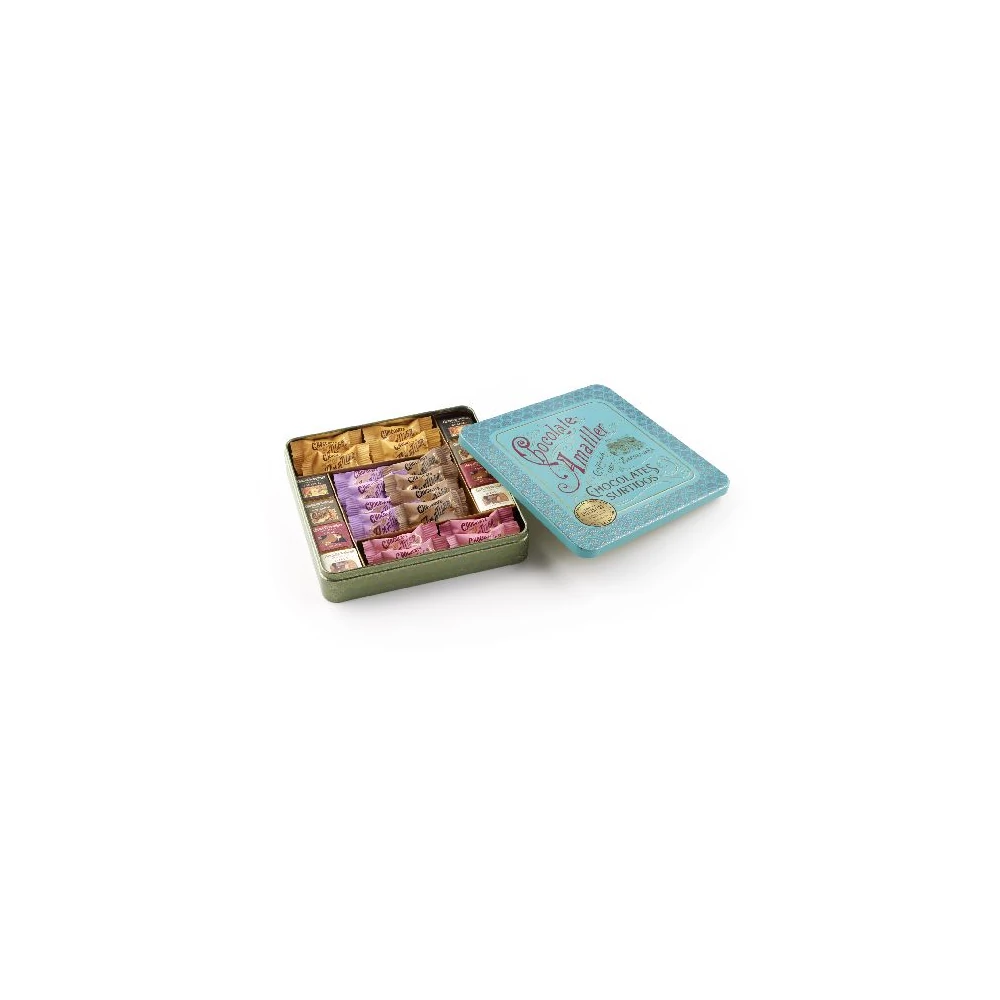 Prémium minőségű spanyol tej-, ét-, fehér-, 70% ét csokoládé válogatás (narancskrémmel, málnakrém, citromkrém töltve) egyenként csomagolva, elegáns fémdobozban.