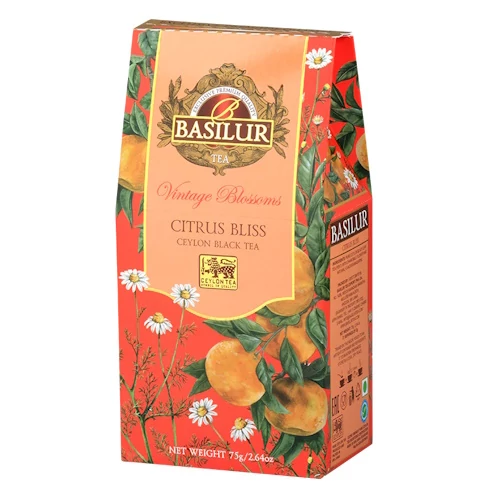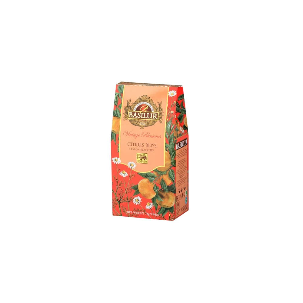 Gondosan válogatott, Nuwara Eliya magashegyi régiójából származó Pekoe levelekből készült ceyloni fekete tea , kamillavirággal és természetes mandarinaromával.
