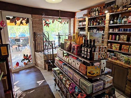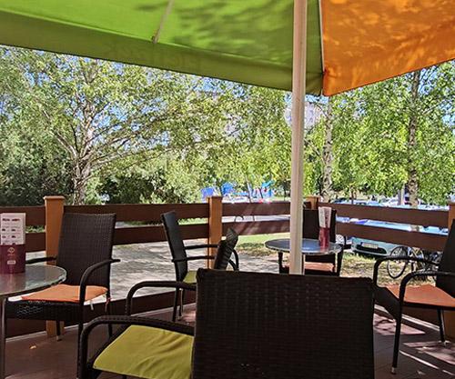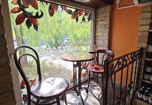 üzletben és az szabad levegőn kisebb létszámban leülési lehetőség egész évben, nyáron 16 fős terasz.