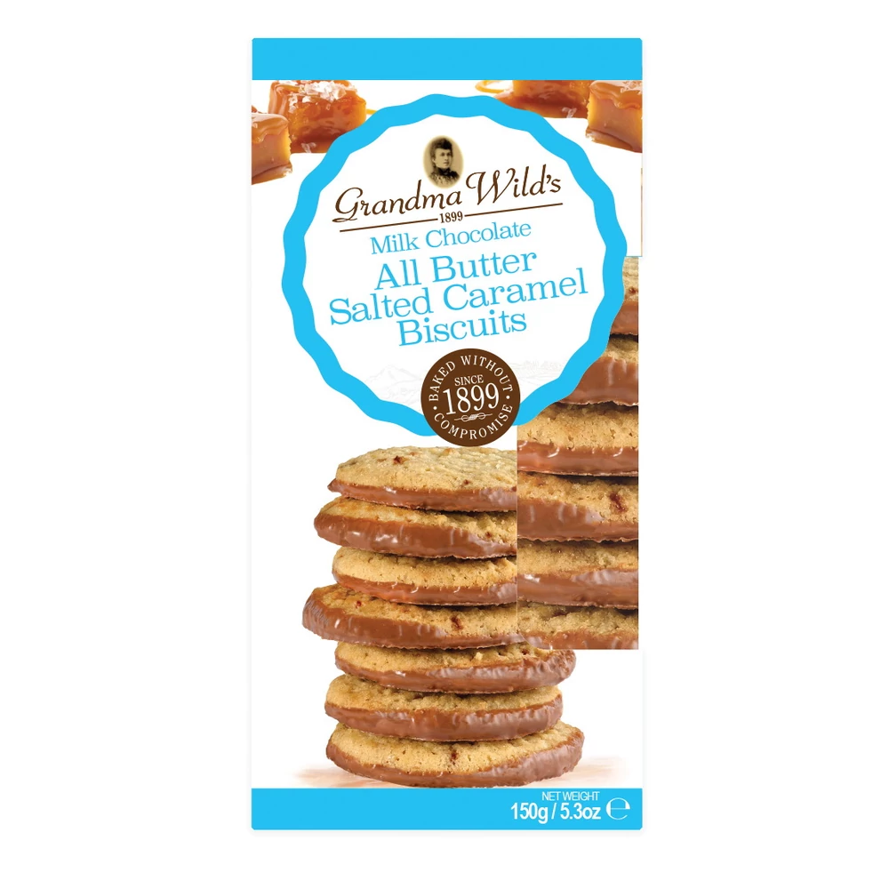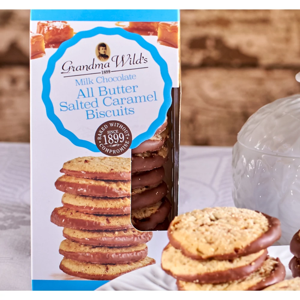 Prémium minőségű angol vajas keksz sós-karamelles ízesítéssel, prémium papírdobozban.
