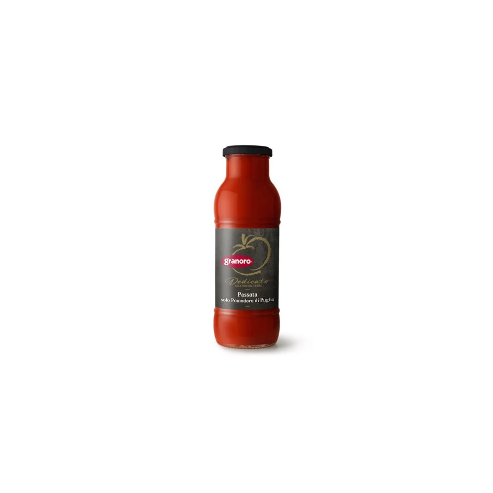 A Granoro paradicsomkonzervjei, a hámozott paradicsomoktól kezdve a cseresznyeparadicsomokon át a paradicsompüréig, mind Olaszországban termesztett, gondosan válogatott és a betakarítást követően néhány órán belül feldolgozott paradicsomból készülnek. A Granoro paradicsompüré friss, Olaszországban termesztett paradicsomból készül. A püré sűrű, krémes és lágy, alacsony víztartalmú, magas természetes cukortartalommal rendelkezik, és üvegpalackokban kapható, ami ideális egy 4 fős család átlagos fogyasztásához. Az esetleg megmaradt pürét hűtőben néhány napig eláll.